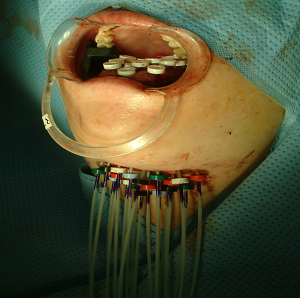 혀에 발생한 암으로 근접 방사선 조사를 위하여 방사선 선원을 혀 부위에 위치시켜 국소적으로 고선량 방사선을 조사하는 방법입니다.